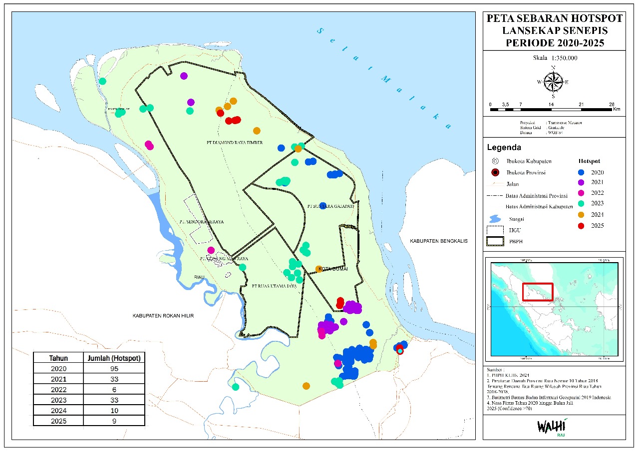 Senepis merupakan bentang alam seluas ±322.183,74 ha dengan tutupan hutan, sungai, dan mangrove yang berada di Kabupaten Rokan Hilir dan Kota Dumai. Bentang alam ini awalnya merupakan rumah bagi Harimau Sumatera, namun alih fungsi hutan menyebabkan rusaknya habitat satu-satunya spesies harimau yang tersisa di Indonesia. Sebab 55,97% lanskap senepis telah didominasi oleh perizinan korporasi. Dominasi ini yang kemudian menyebabkan banyaknya kerusakan lingkungan hidup, termasuk karhutla seperti yang saat ini terjadi di lanskap senepis.