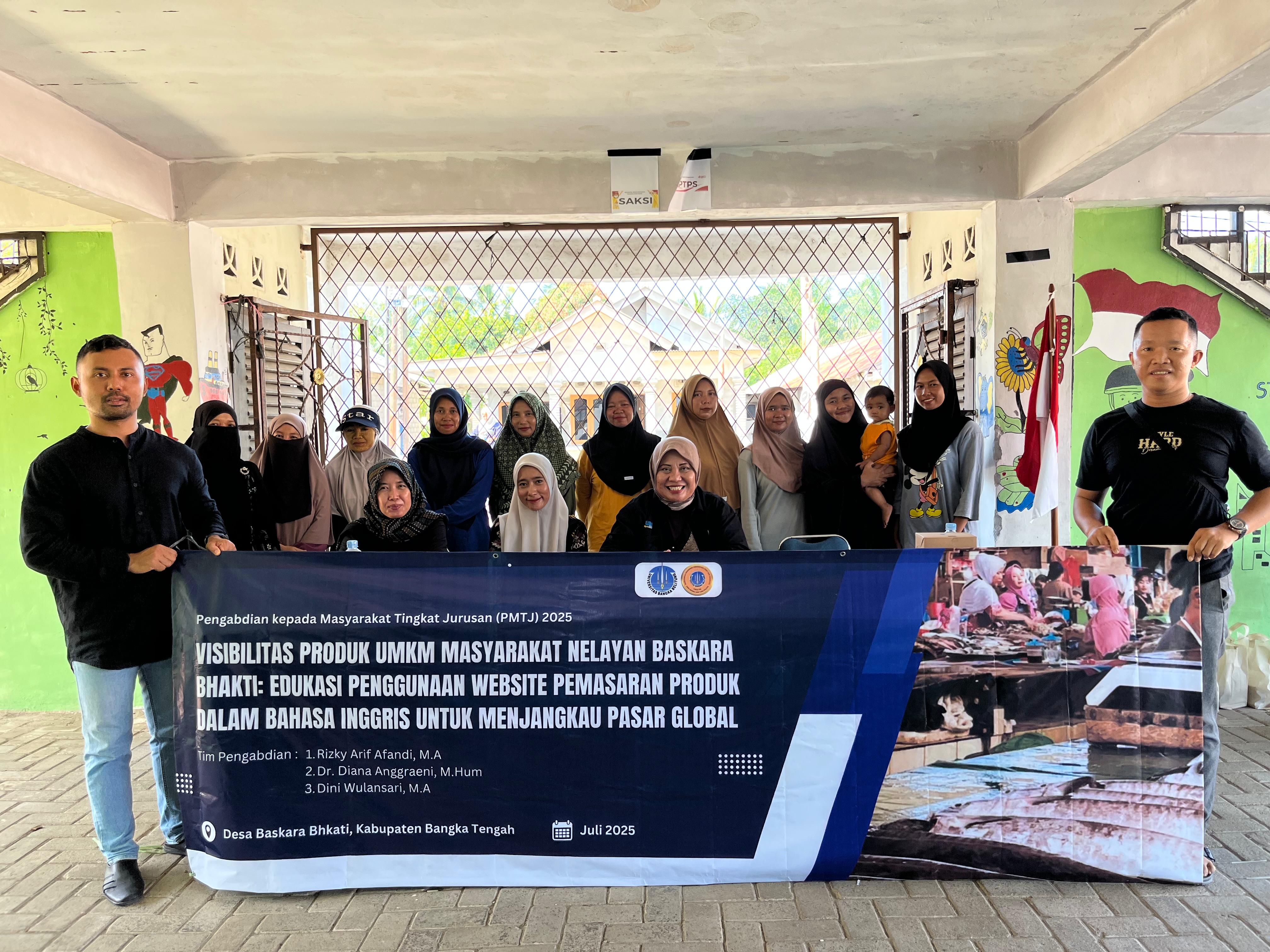 Kegiatan yang dipimpin oleh Rizky Arif Afandi, M.A, dosen Sastra Inggris, dengan anggota tim Dr. Diana Anggraeni, M.Hum dan Dini Wulansari, M.A ini berlangsung di kawasan pesisir Baskara Bhakti, Kabupaten Bangka Tengah, dan melibatkan para pelaku usaha mikro kecil menengah (UMKM) berbasis hasil laut dari komunitas nelayan setempat.